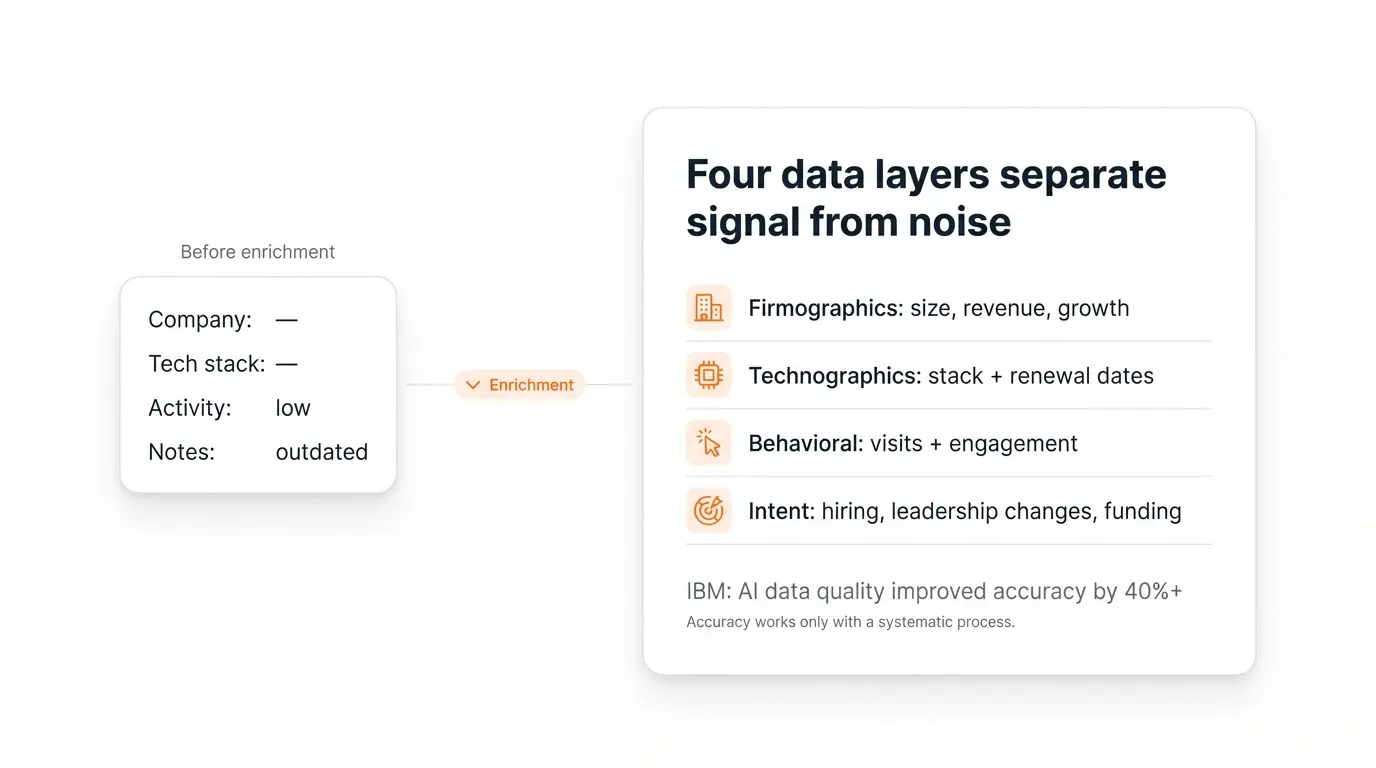 According to IBM research, companies using AI for data quality saw accuracy improve by over 40%. But accuracy only matters if you follow a systematic process instead of randomly appending fields to make your CRM look fuller.