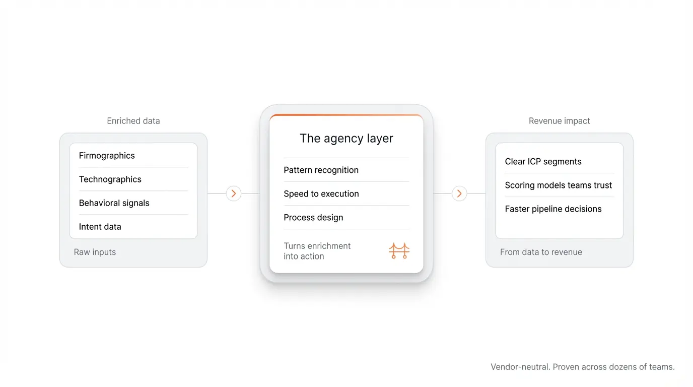 The best agencies don't just enrich your data and hand it back. They help you interpret patterns, build scoring models, segment your ICP, and train your teams to act on what the data reveals. They become the bridge between raw enrichment and actual revenue impact.